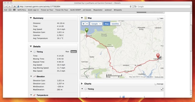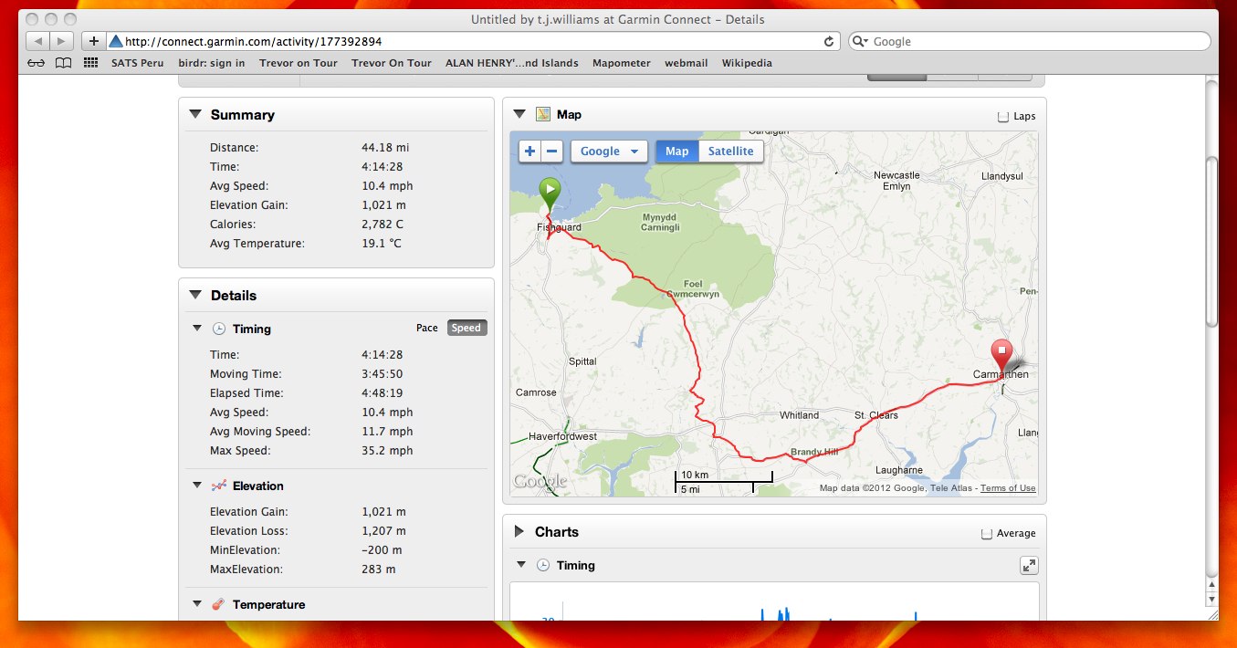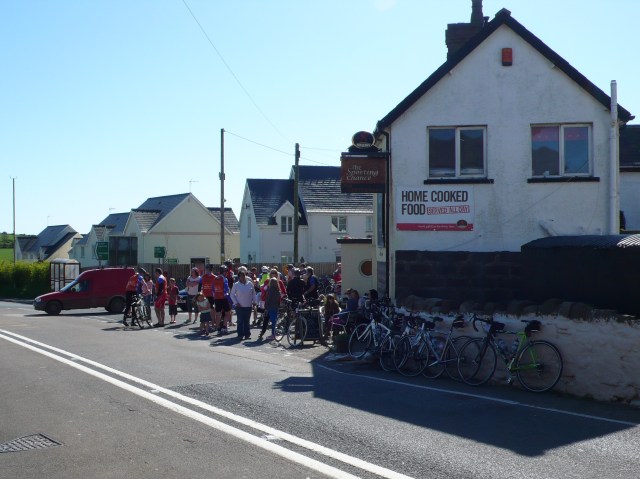 On the outline itinerary todays ride looked a breeze – two minutes from our digs to the ferry, all morning on the boat, off at one o’clock and a gentle ride through the West Wales countryside to Carmarthen and our over-night accommodation. Now that was something to look forward to, particularly as the weather in Wales promised to be significantly better than it had been in Ireland. Well you know what thought did don’t you – it turned out to be one of our most challenging days of the whole trip, with 46 miles covered and nearly 3,500ft total ascent in half a day! The crossing went to schedule with the sea being flat calm for the entire trip. A slight hiccough at Fishguard when we were required to produce our passports but we were soon on our way up an enormous hill which is the exit route from the harbour. Once on the right road the going was initially easy – picturesque country lanes, stunning scenery, an abundance of wild flowers and warm sun on our backs – and then the hills began! Their pattern becoming wearily familiar – a long steady incline, down through the gears, grind away in bottom until over the crest, followed by a helter-skelter descent round a couple of bends, over a stone bridge and around the next bend the hill began again! We did this for twenty odd miles, at one point in the company of a load of fellow cyclists participating in a 50 sportive, before stopping in the town of Narberth for a much needed cuppa and cake. The very nice couple running the cafe were interested in what we were up to and when we came to pay the guy gave us a donation (thanks mate)! We set off on the second half refreshed but with ever increasing aching legs. The pattern of the first half was to be repeated for most of the remaining 25 miles. At one point I was in bottom gear and out of the saddle to maintain forward momentum – I wish I hadn’t bothered! At Red Roses, where we turned on to the A477, we encountered the ‘Carten contingent’ – hundreds of mad riders cycling from Cardiff to Tenby! Well done you guys, it puts our efforts for the day into perspective. The final dozen or so miles were on the busy A40 dual-carridgeway into Carmarthen, where we arrived at the Drovers Arms at 17.50.
